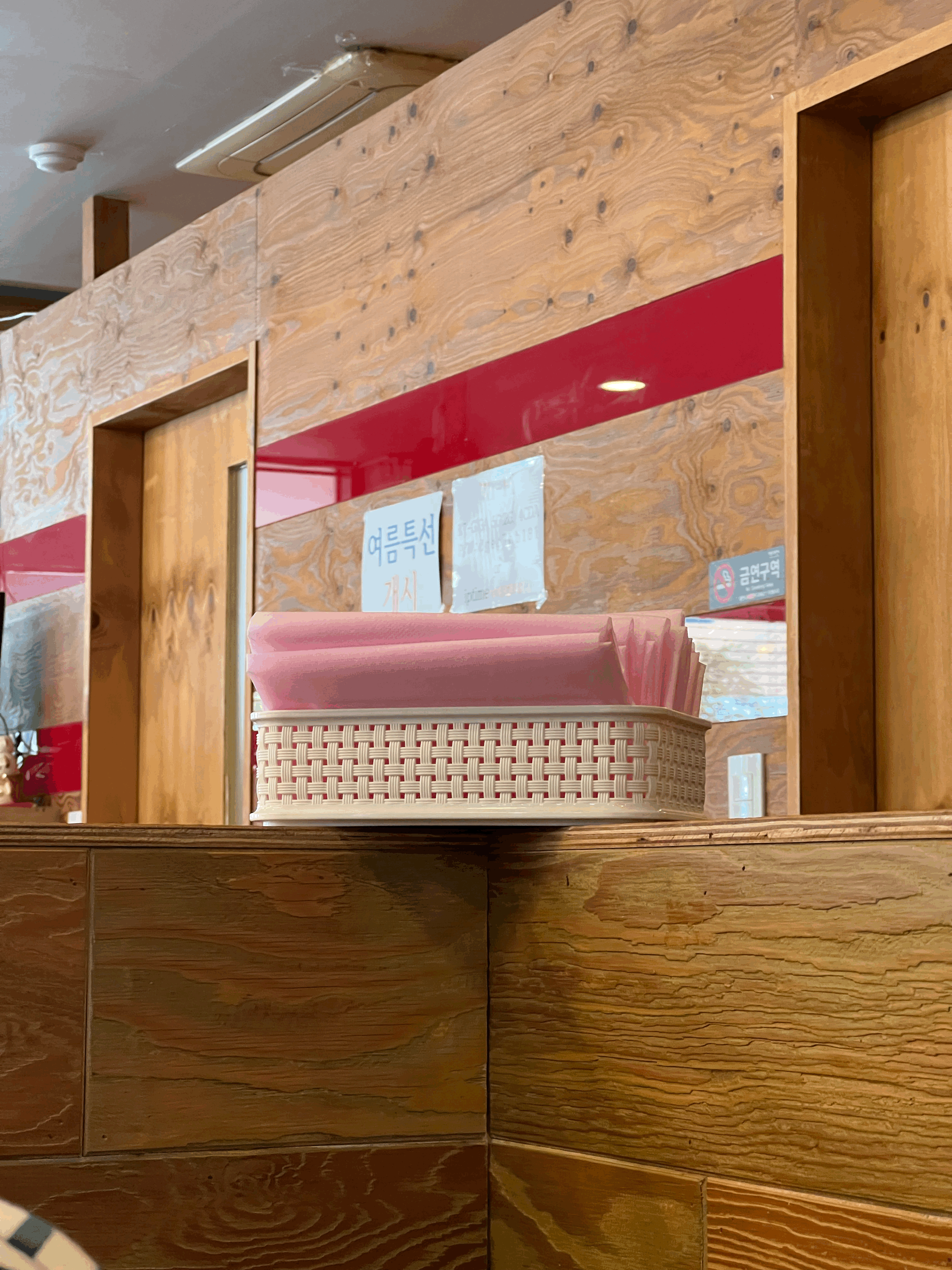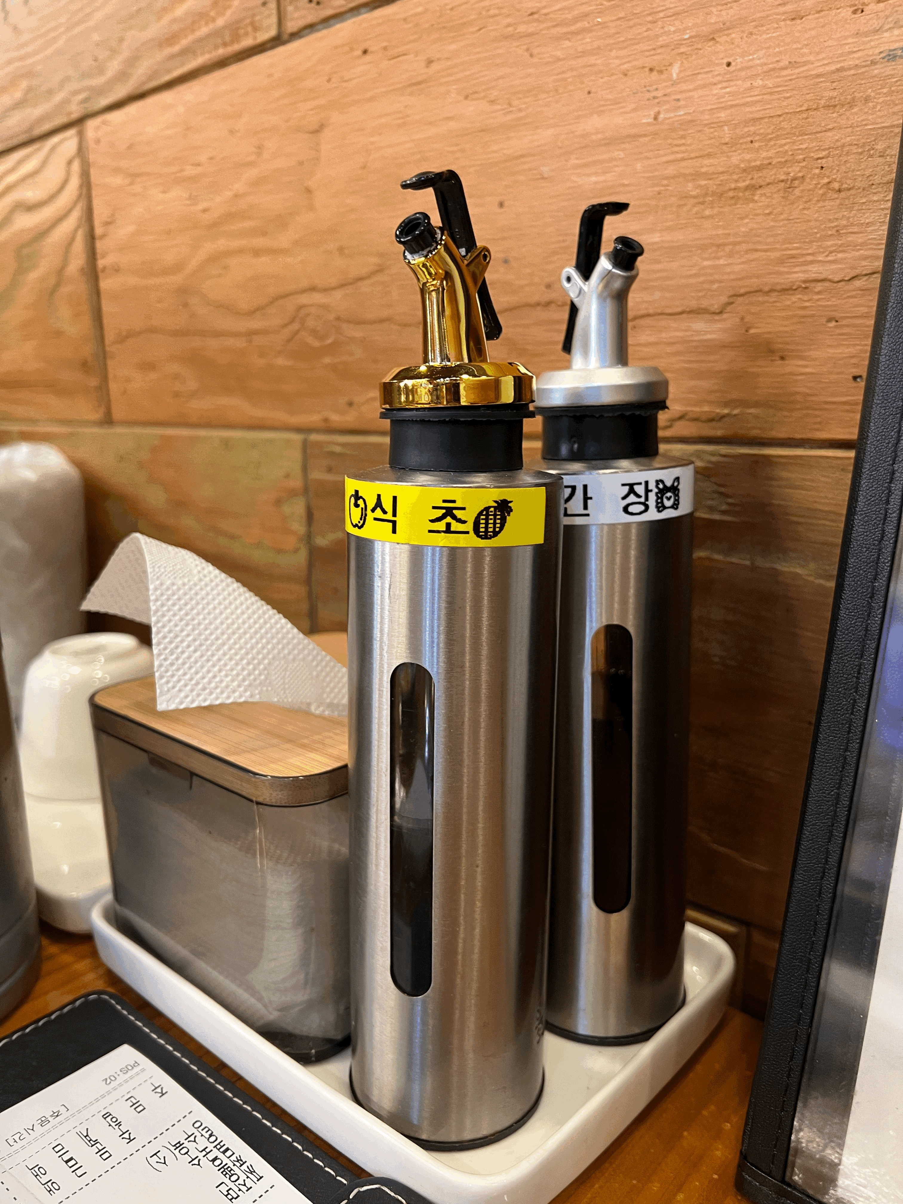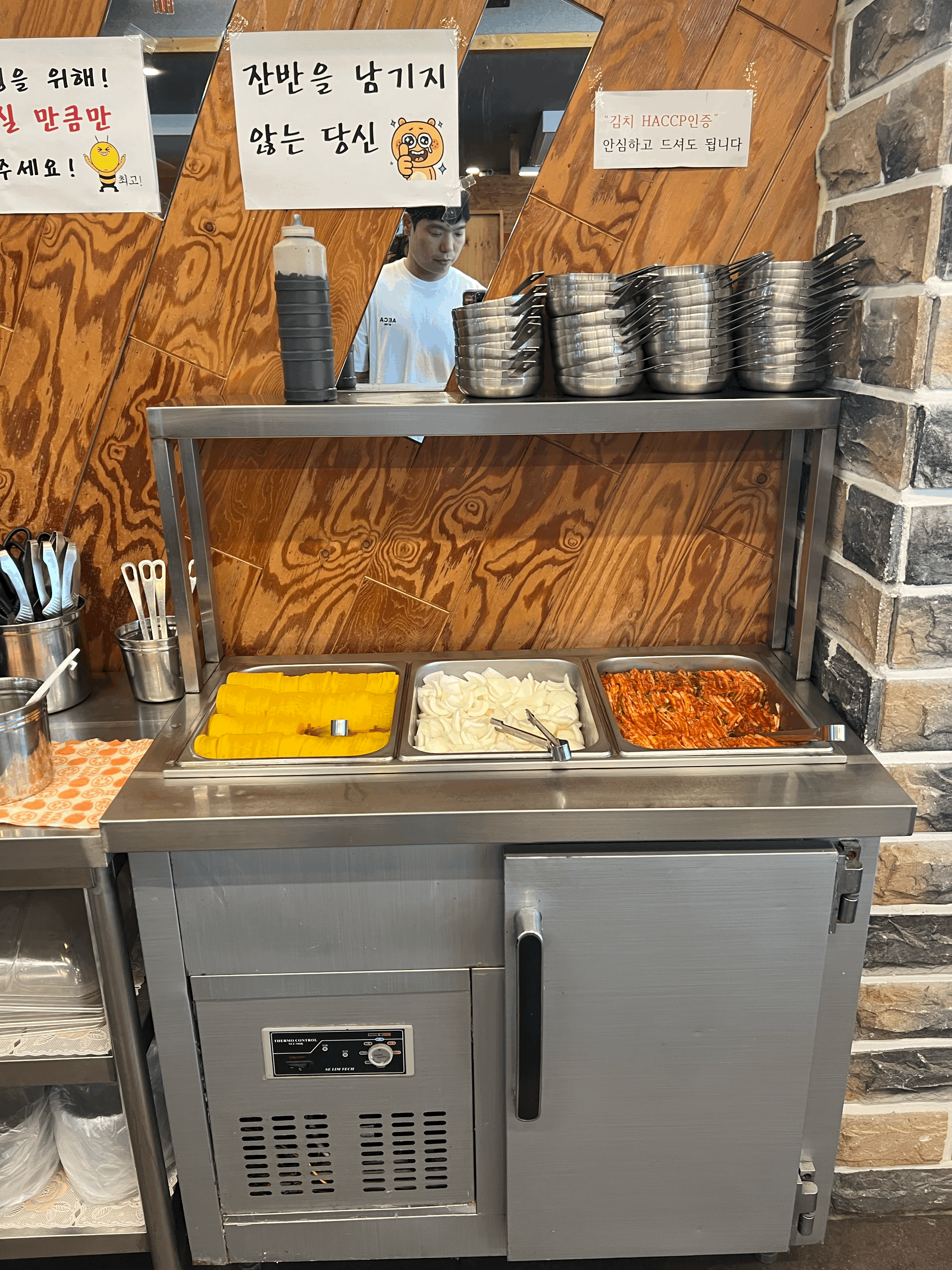 용인 중국 음식 맛집 공리에는 오픈형 주방만큼이나 깔끔하게 식기들도 구비되어 있습니다. 특히 간장 식초 통은 참 깔끔 하이 마음에 들더군요! 앞치마는 일회용이어서 더 깔끔하게 사용할 수 있었습니다. 기본반찬은 셀프로 가져다 드실 수 있으며 김치는 HACCP인증도 받았다고 하니 그것 또한 마음에 드네요.