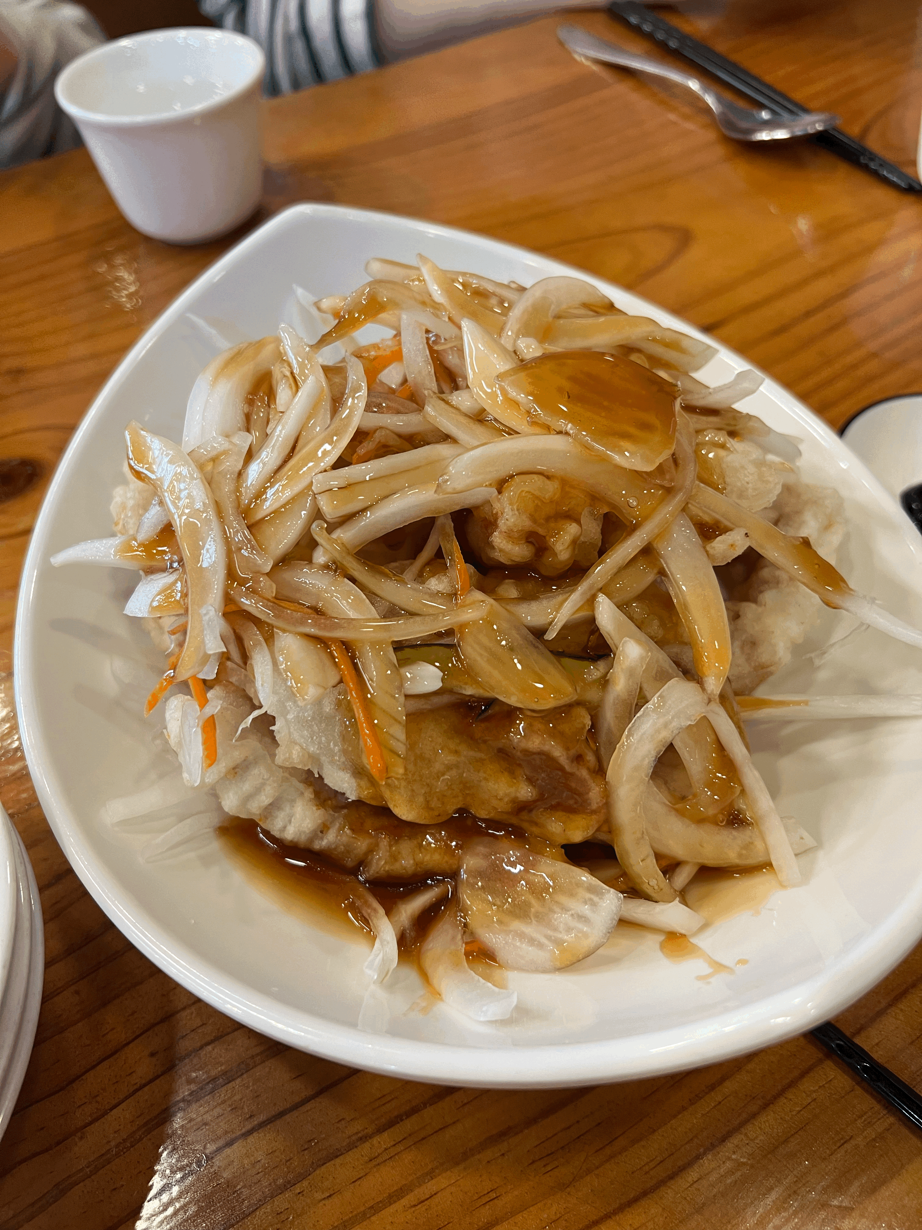 처음 나온 요리는 탕수육입니다. 평소 다양한 중국음식을 즐겨 먹지만 아이와 함께 먹기에는 탕수육만 한 것이 없지요! 공리 탕수육은 처음 주문할 때 '소스를 따로 드릴까요?'라고 묻지 않아 조금 의아했습니다. 최근 방문한 중국요리 전문점은 모두 탕수육 소스를 어떻게 할지 손님에게 묻곤 했거든요. 볶먹이 진리라는 것은 알지만 가끔 특제 소스라며 취향에 안 맞는 소스가 나오는 식당은 볶아져 나왔을 때 돌이킬 수 없기에 조금은 걱정이 되었습니다. 하지만 공리의 탕수육은 그런 걱정들을 기우로 만들어버릴 정도의 굉장한 맛이었습니다. 왜 짬뽕맛집으로 광고를 하고 있는지 모를 정도로 이 집은 탕수육 맛집입니다. 소스의 달큰 새콤한 정도와 점도, 고기 튀김의 바삭한 겉옷과 충실한 고기 크기에서 다른 건 차치하고라도 탕수육은 꼭 먹어야 할 맛집으로 생각했습니다.