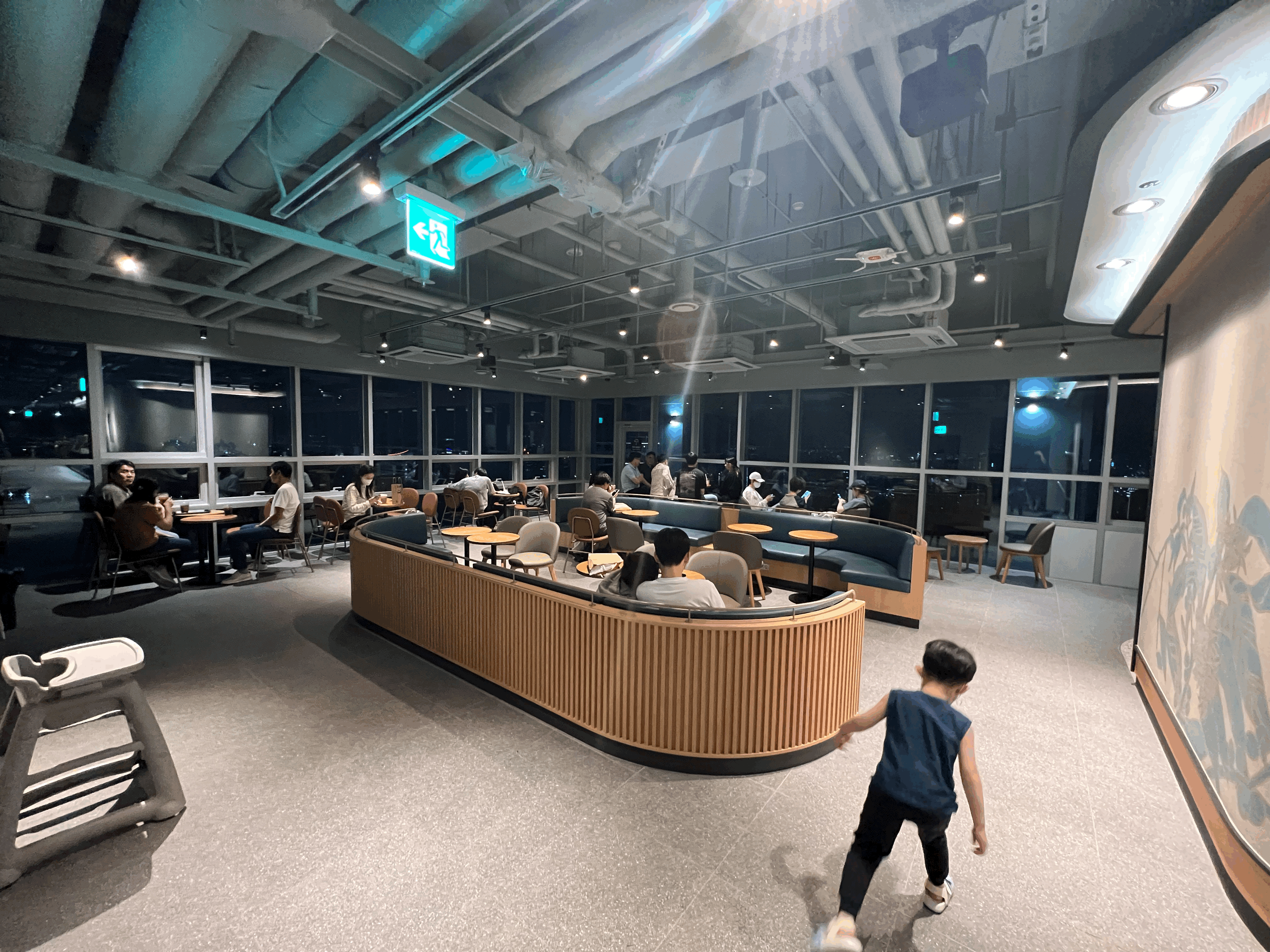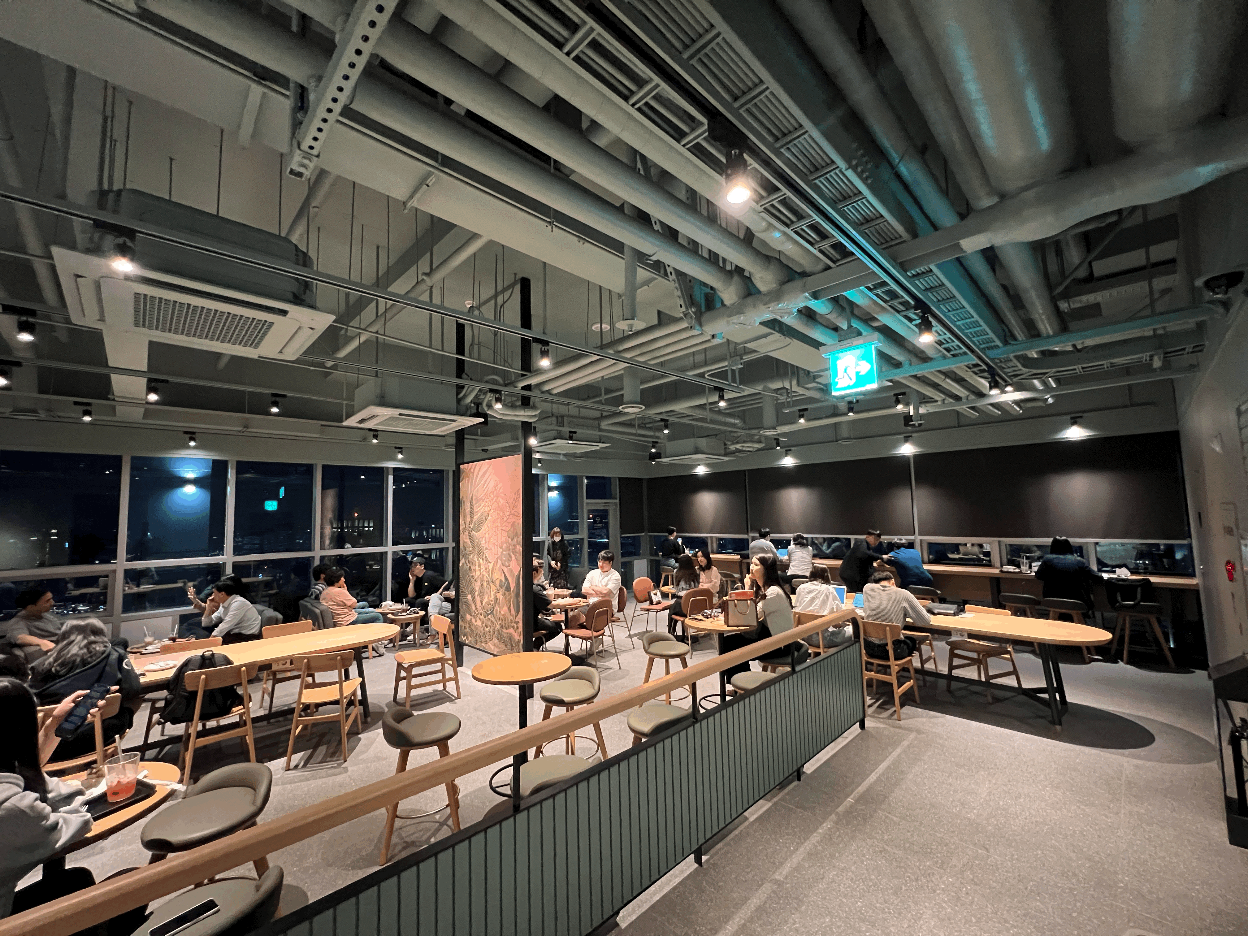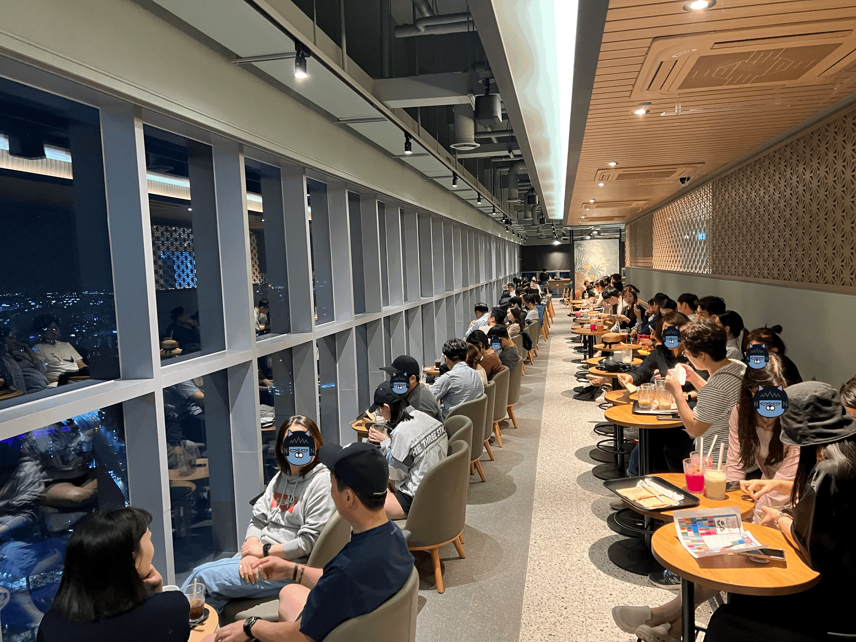 다른 곳은 생각보다 여유롭게 배치를 하였습니다. 화장실과 반납구 쪽은 완전 넓게 비워놓았고요. 다른 좌석들의 배치도 나름 뷰를 향하게 되어있으면서도 좌석 간 배치가 나름 여유롭습니다. 시간이 늦어서 군데군데 빈 곳도 보이네요. 일반적인 스타벅스의 인테리어와도 다르지 않으나 저 창문 밖이 41층 높이라니 확실히 특색은 있습니다.