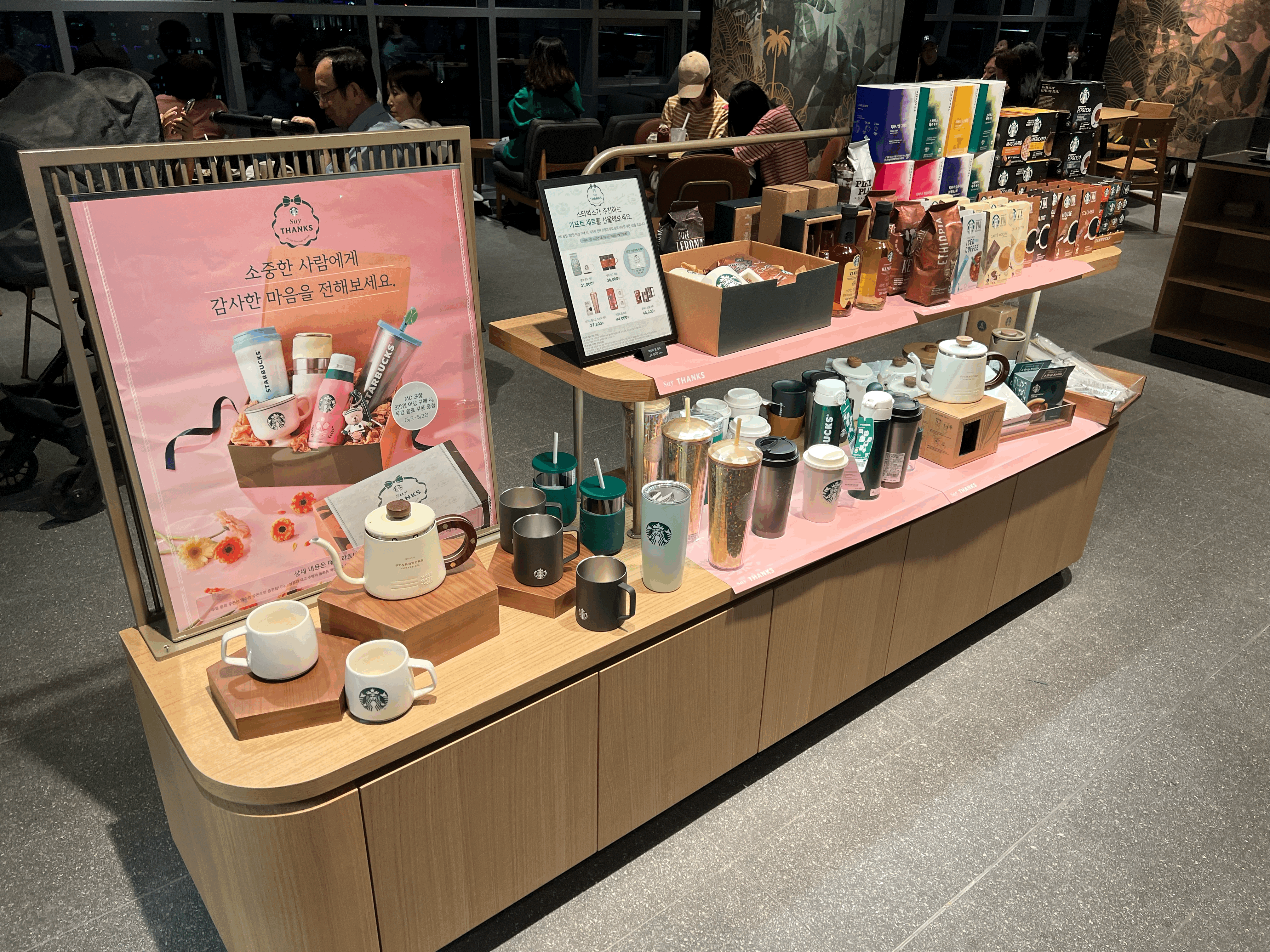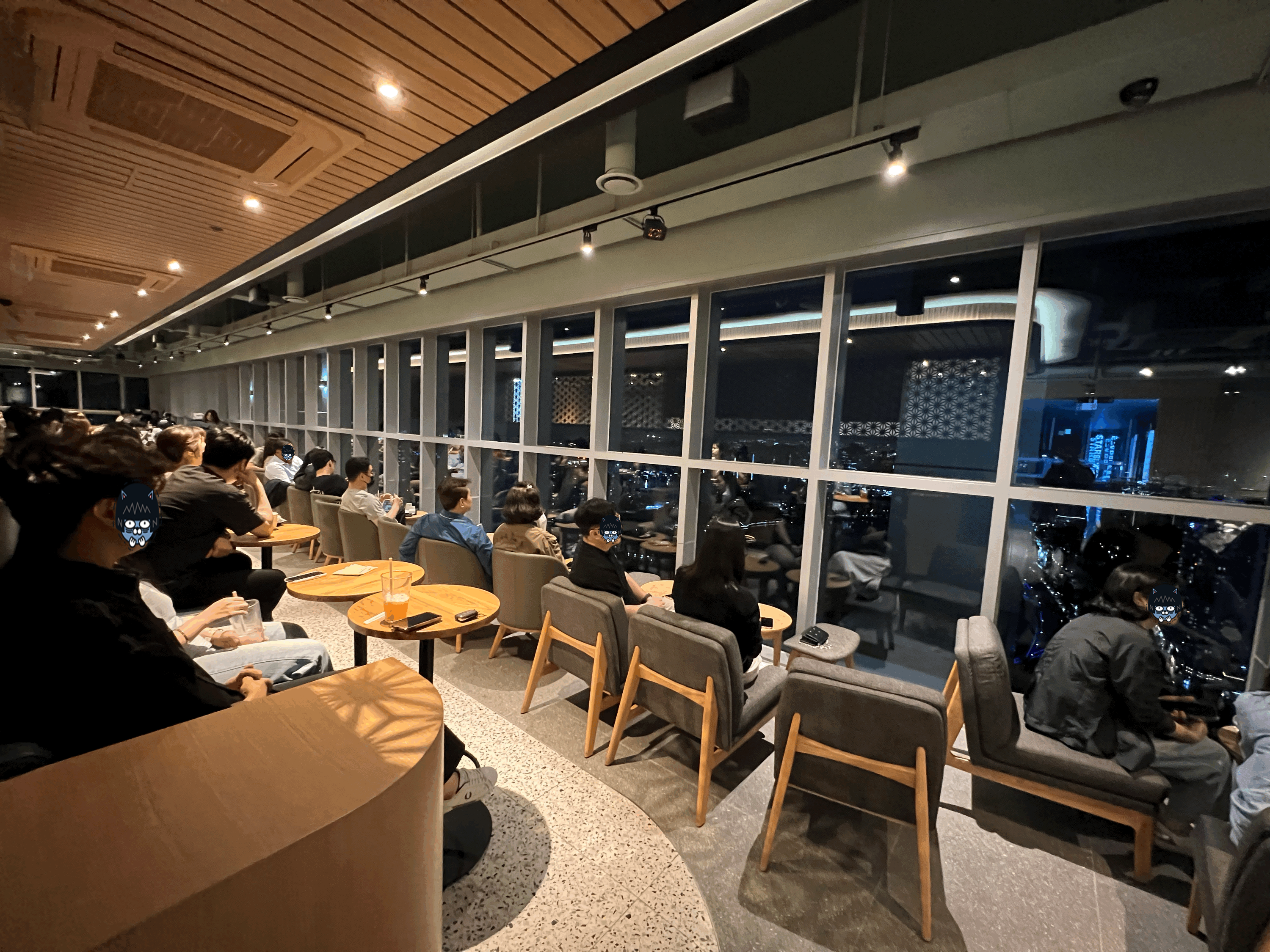주문하는 곳 뒤쪽으로 길게 뻗어진 자리가 있습니다. 창가를 보고 앉을 수 있게 되었있는데, 생각보다 자리가 많지 않습니다. 스타벅스에서는 영리하게 높이를 달리 한 테이블 구조로 2개의 뷰 자리를 만들어 냈습니다. 아이디어가 좋네요. 뷰가 좋아서 일까요, 자리를 차지하기 힘들어서 그럴까요? 어떤 분들은 책상에 가방과 음료를 두고 30분 넘게 나타나지 않는 분들도 게시더군요. 물론 자리를 얻기 힘들었을 것은 이해가 되지만 그 자리만큼은 눈살이 찌푸려졌습니다. 창문의 유리는 내부가 너무 밝아서 거울처럼 반사가 많이 이루어져 가까이 앉지 않으면 경치를 온전히 감사하기가 힘들었습니다. 낮에 오면 조금 다를 것 같지만, 일몰 이후 오시는 분들은 어떻게든 자리를 꼭 잡으셔서 앉으셨으면 좋겠습니다(저는 끝까지 앉지 못했습니다)