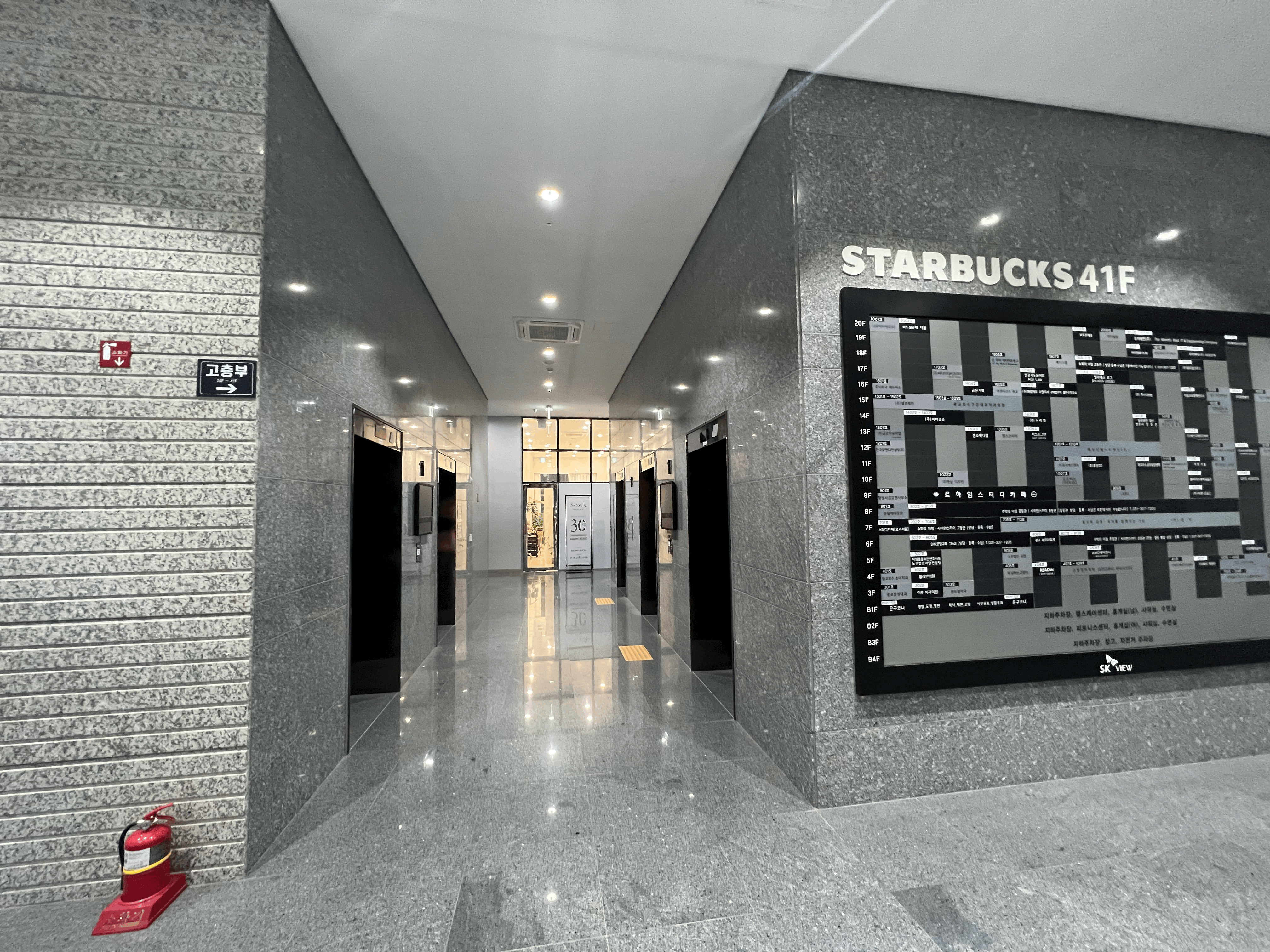 이름과 같이 41층에 위치하였기 때문에 엘리베이터도 고층부 엘리베이터를 따로 이용하셔야 합니다. 전체 층별 안내도 맨 위에 STARBUCKS 41F라고 적혀 있어 이 빌딩에서 스타벅스매장이 어느 정도 상징성을 갖고 있구나 생각하게 되네요.