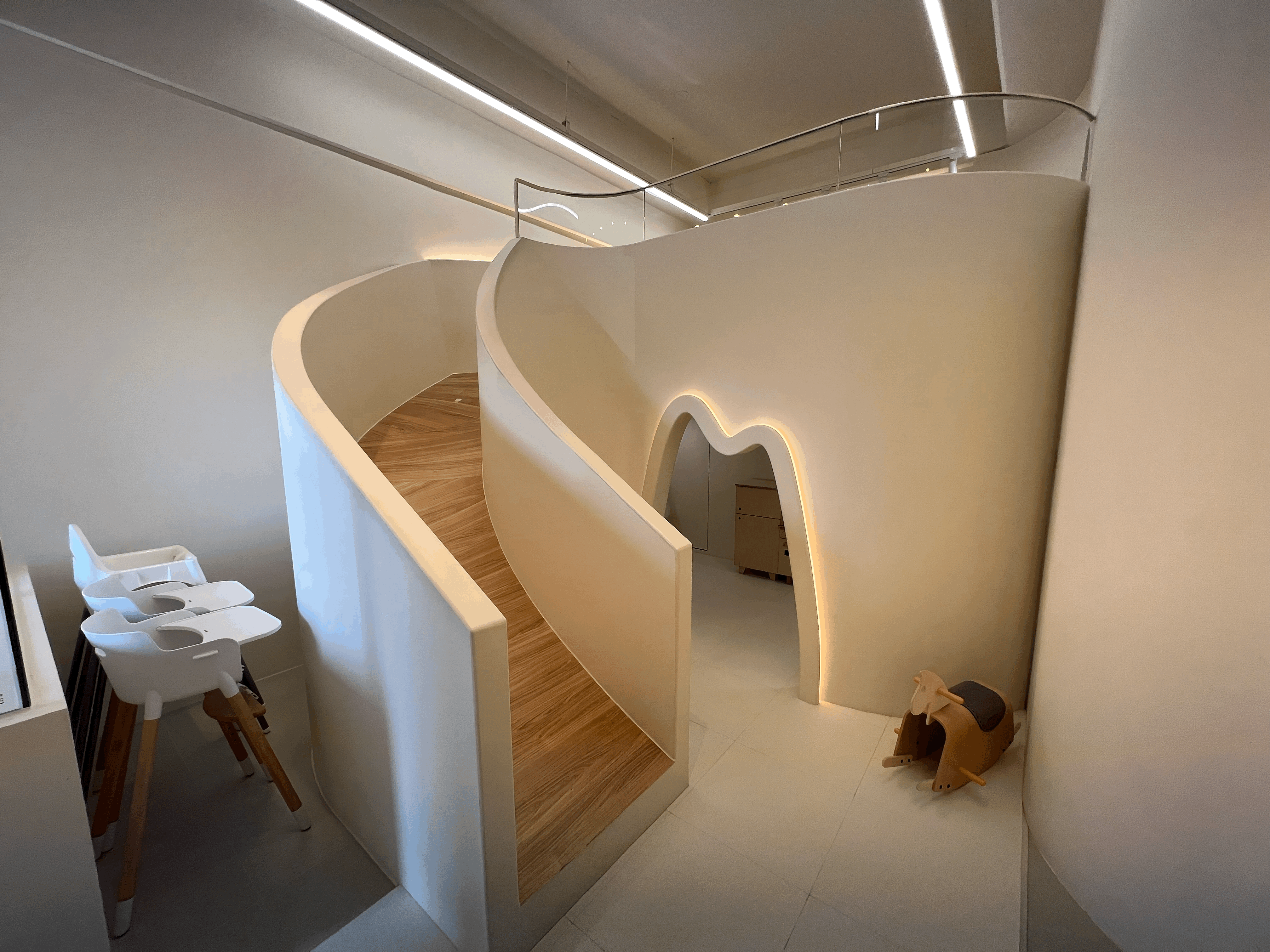반대쪽으로 시선을 돌리면 멋들어진 미끄럼틀과 상층부와 하층부로 나뉜 소꿉놀이터가 있습니다. 여기 미끄럼틀에 대해서 글 초반에 우선 드릴 말씀이 있습니다. 우선 키즈풀의 단조로움을 없애기 위하여 소꿉놀이터를 구성하고 공간 활용과 아이들의 호기심을 자극하고자 2층으로 구성한 점은 높게 평가하고 싶습니다. 실제로 내부에 놀거리들이 가득하여 아이들이 풀에서 놀고 난 뒤에도 시간이 끝날 때까지 놀거리가 가득했거든요(아래 사진들로 추가 설명 드리겠습니다) 다만 처음부터 계획되어 있던 것이 아니라고 생각될 정도로 미끄럼틀의 경사가 급하고 바닥이 미끄럽습니다. 제가 안전점검차 미리 타 보았는데 무릎과 팔꿈치에 살이 벗겨지는 상처를 입었습니다. 그 뒤로 아이들에게는 사용을 금지하였지요. 우리 아이 중 한 아이가 몰래 타고 내려오다가 너무 미끄러워서 살이 쓸려 울기도 하였습니다. 급격한 경사, 미끄러운 바닥면 거친 벽면의 조화는 다치기 너무나 좋은 환경입니다. 개선이 반드시 필요해 보이는 부분입니다.