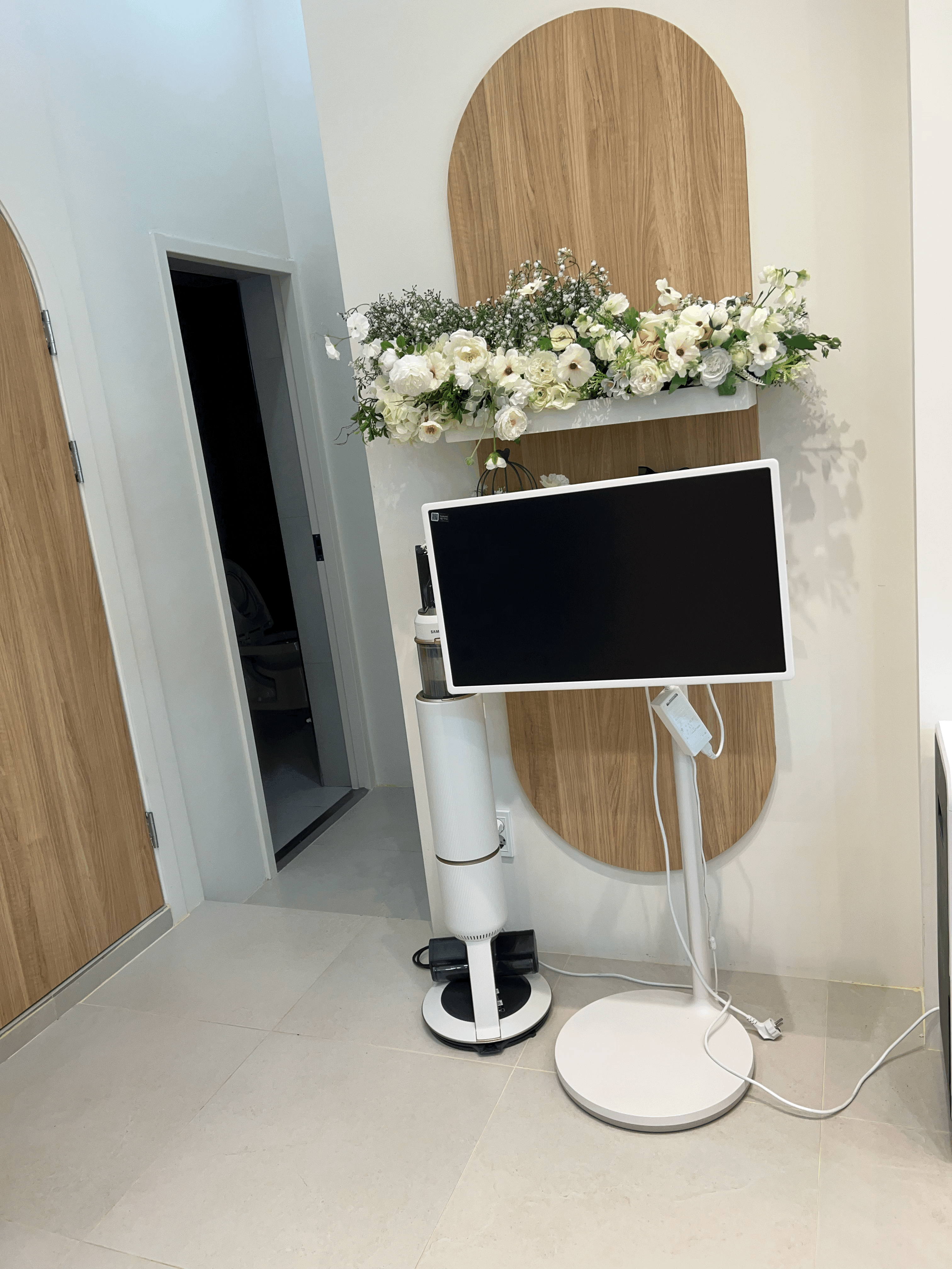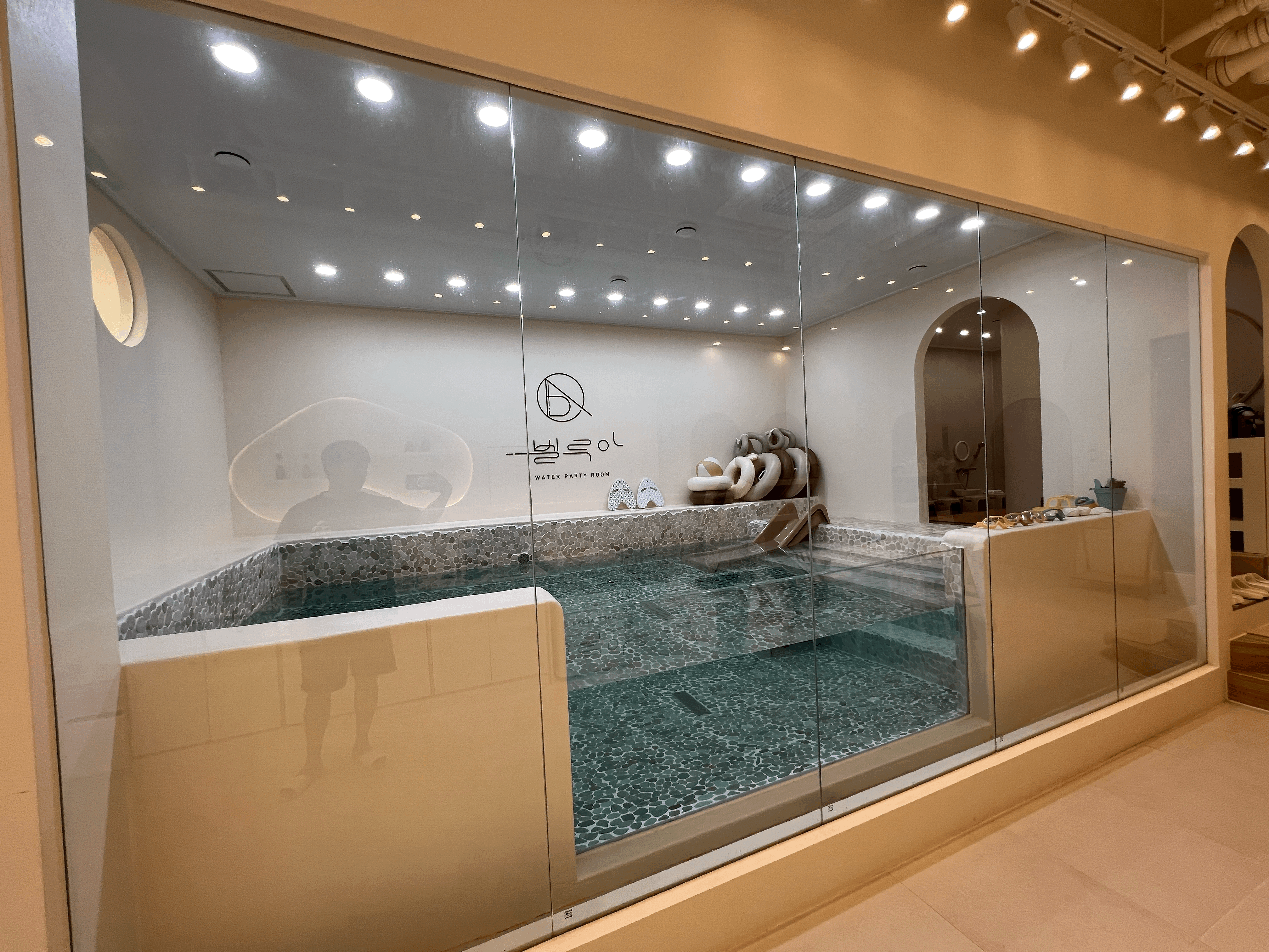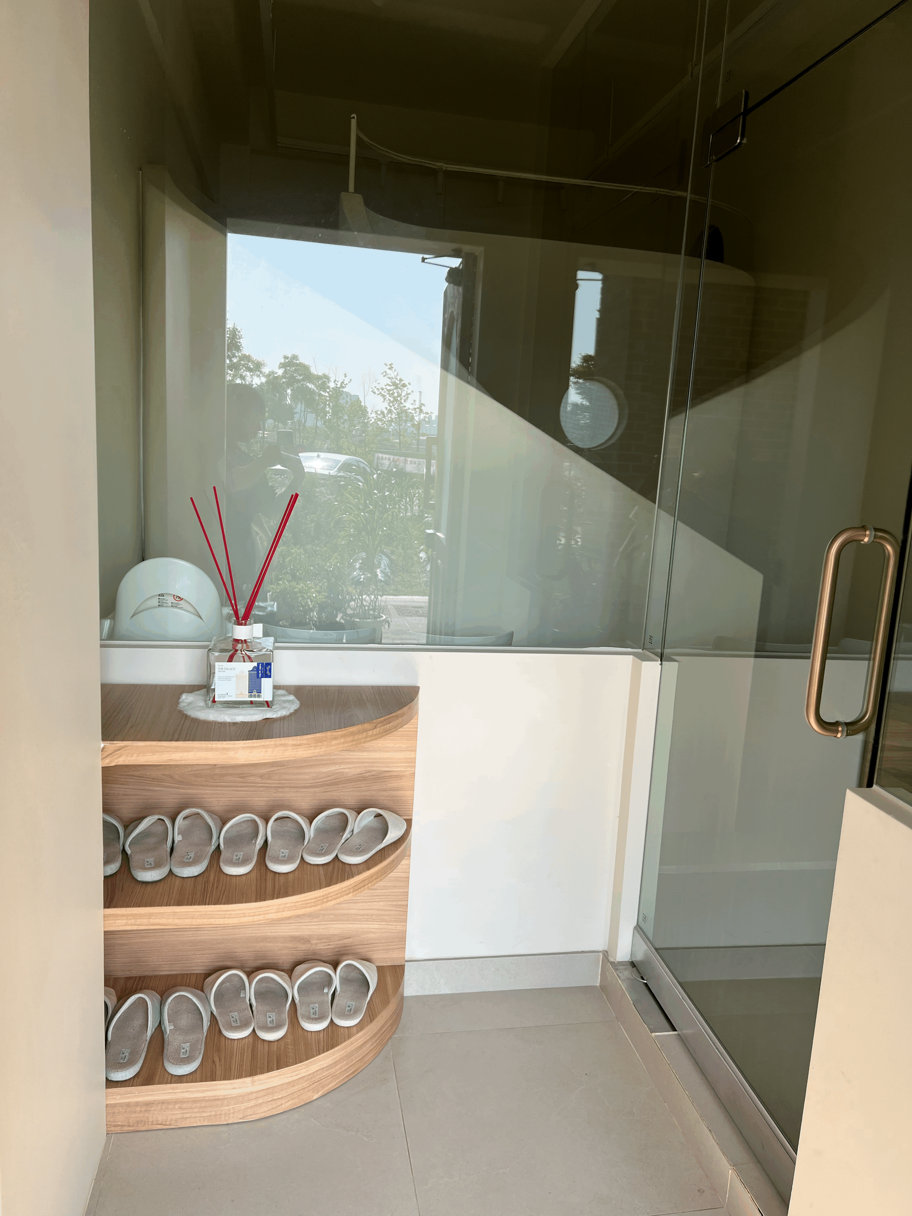 문을 열고 벨루아 내부로 들어가면 신발을 벗을 수 있는 공간과 중민이 있습니다. 빨간색 스틱을 꽂은 디퓨져가 포인트가 되네요. 건물 바로 인근에 하천이 흐르기에 중문이 없으면 외부 벌레들이 유입이 쉬울 것 같은 구조입니다. 그리고 워터파티룸 특성상 내부 온습도 조절이 민감할 수 있는데 중문을 통하여 어느 정도 쉽게 관리를 하기 위함인 것 같습니다.