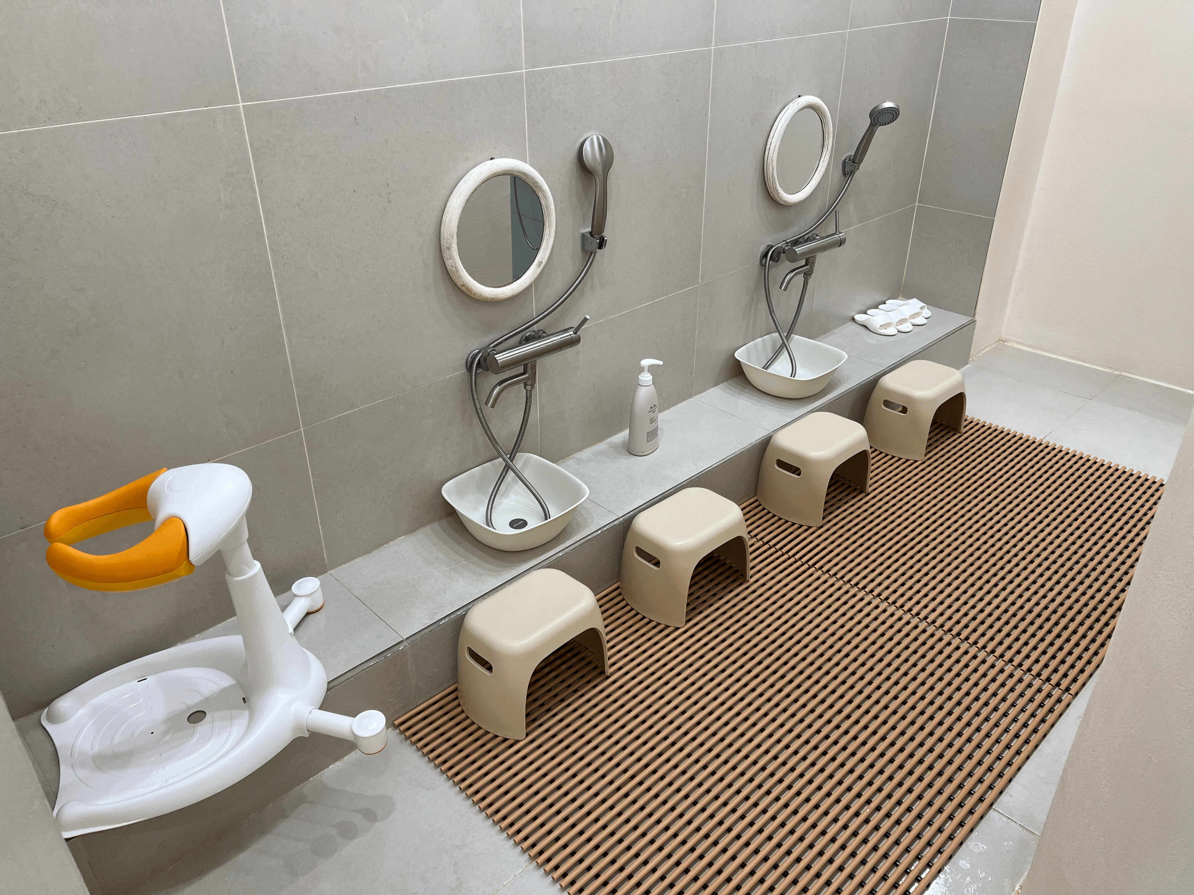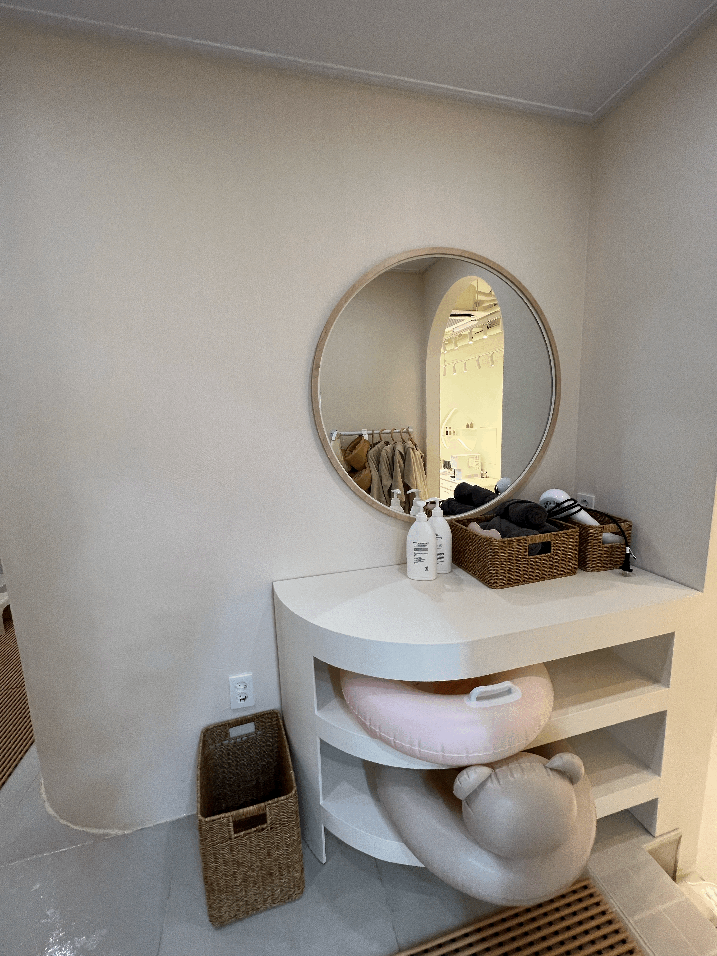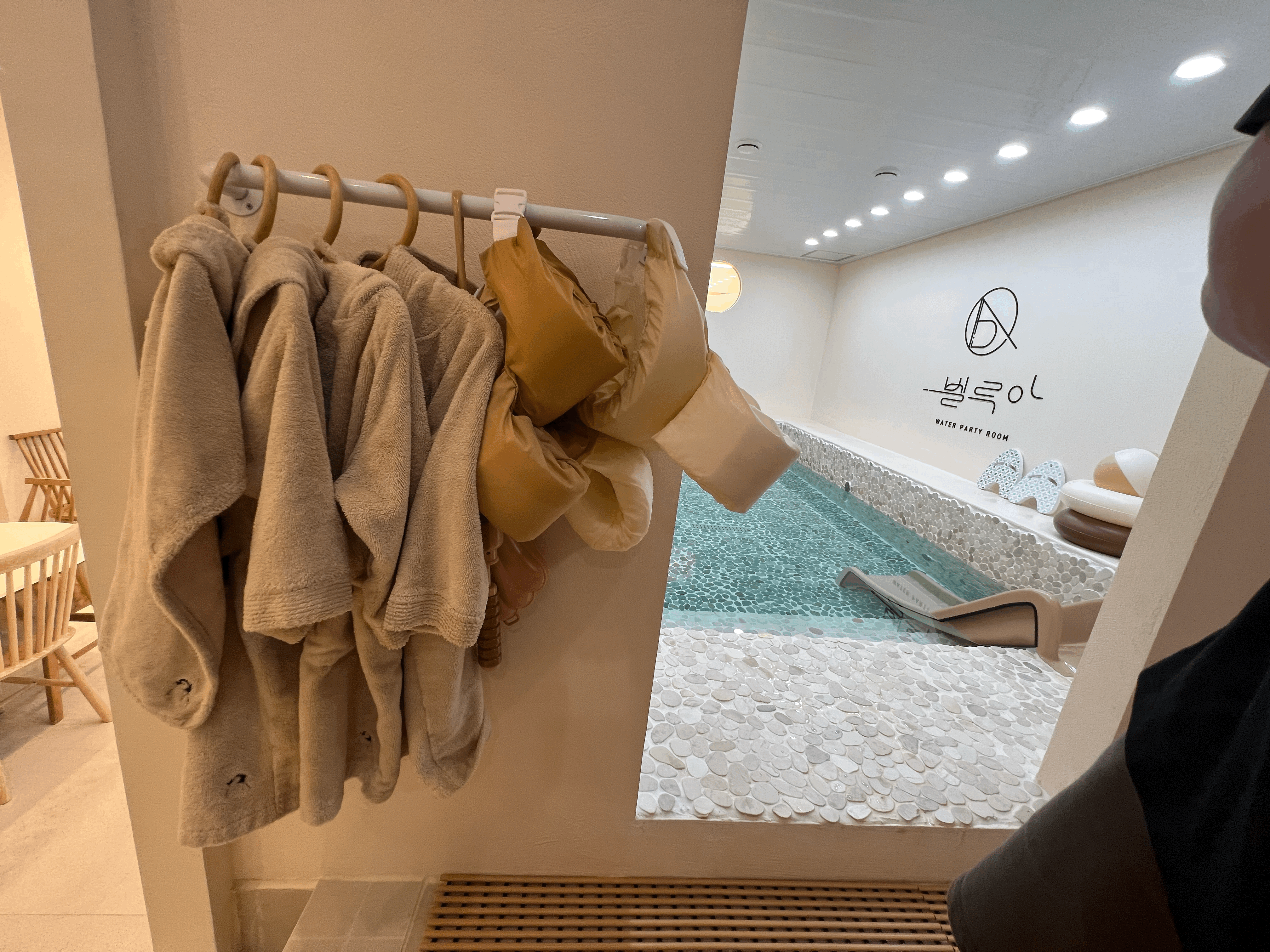 깔끔한 키즈풀만큼 부대시설도 정말 정갈하게 구성해 놓았습니다. 아기자기한 아이 샤워시설과 탈수기, 건조대, 드라이기 및 로션 등이 구성되어 있고 물놀이와 샤워 후 아이가 춥지 않도록 가운까지 마련되어 있습니다.