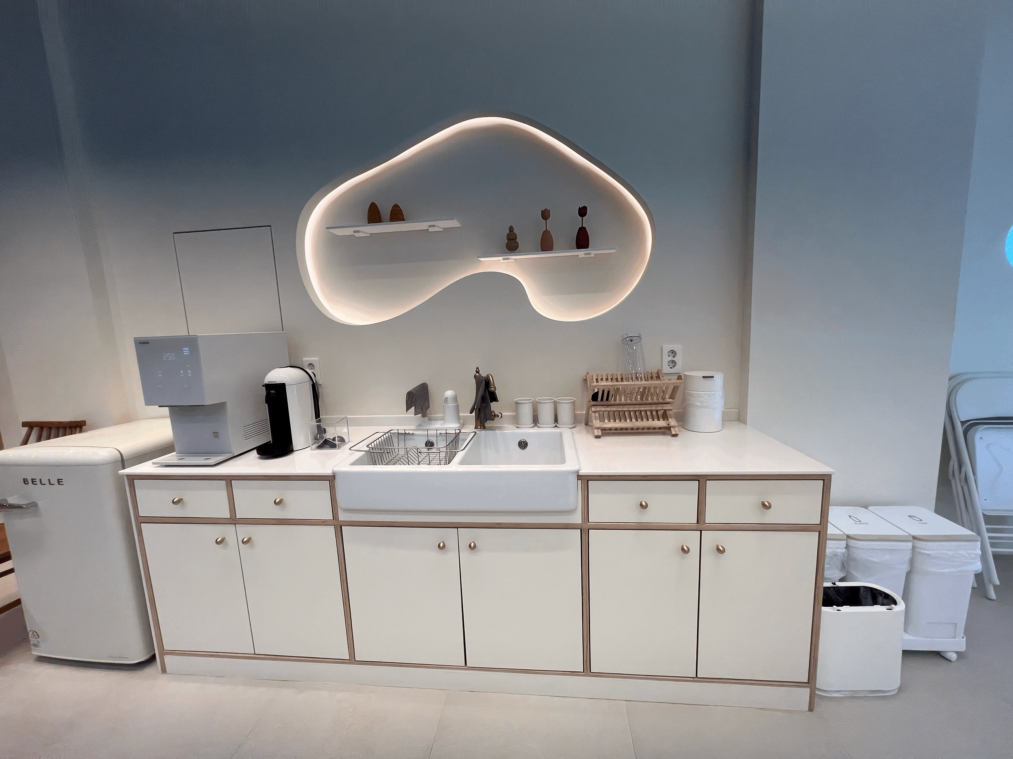 주방의 모습입니다. 얼음정수기와 네스프레소 머신(디카페인 캡슐 네 개 포함)과 서랍장 내 필요한 식기류는 모두 구비되어 있습니다. 조리의 용도보다는 갖고 오신 음식을 먹고 정리하기 위한 용도로 사용하였습니다.