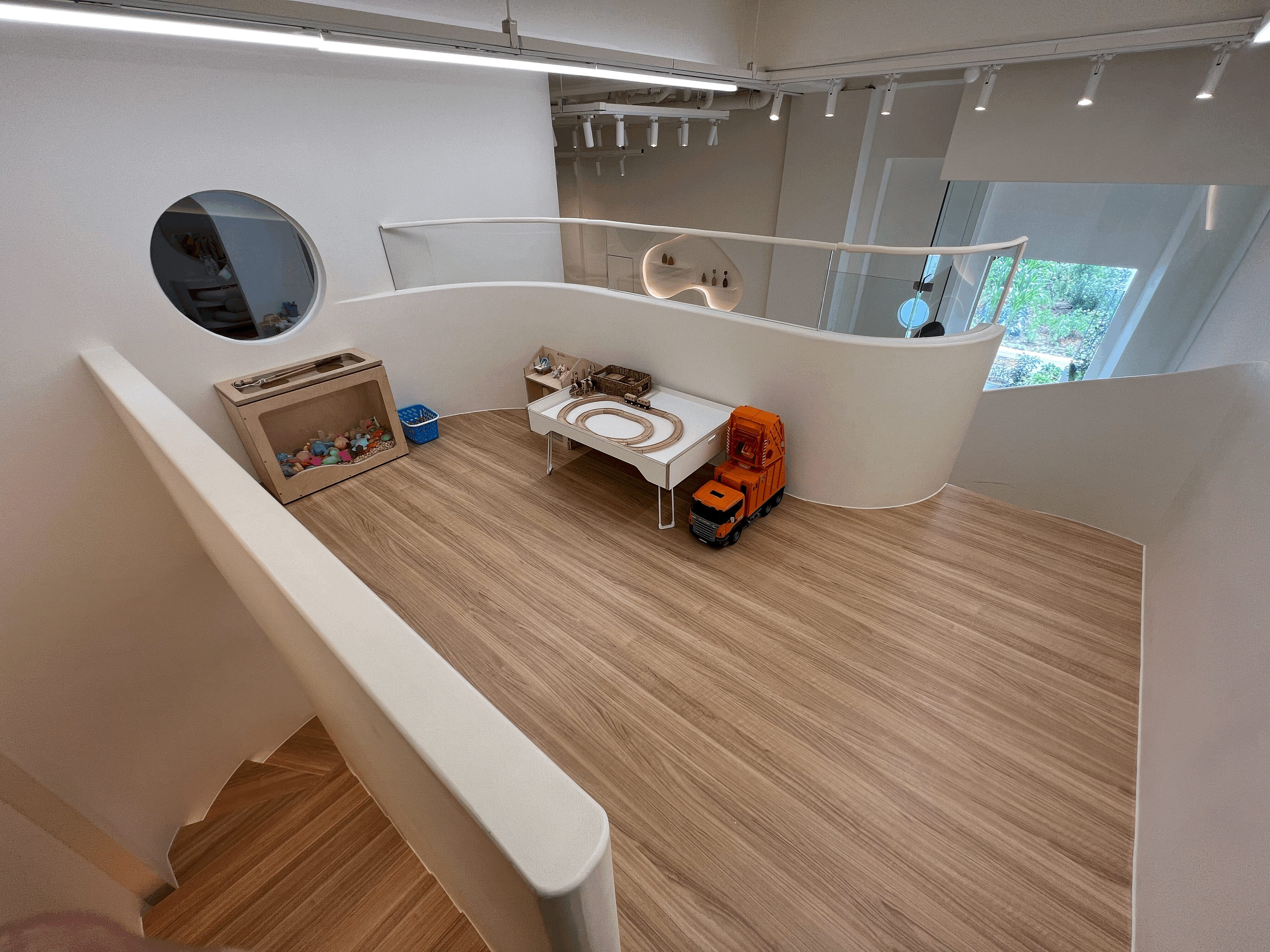 소꿉놀이터 2층은 조금 남자아이를 위한 장소입니다. 낚시하기와 기차놀이, 대형 트럭까지 갖춰져 있어 지루할 틈이 없어 보입니다. 우리 아이들은 2층에서 낚시를 해서 1층에서 요리를 하는 기특한 모습을 보여주기도 했지요.