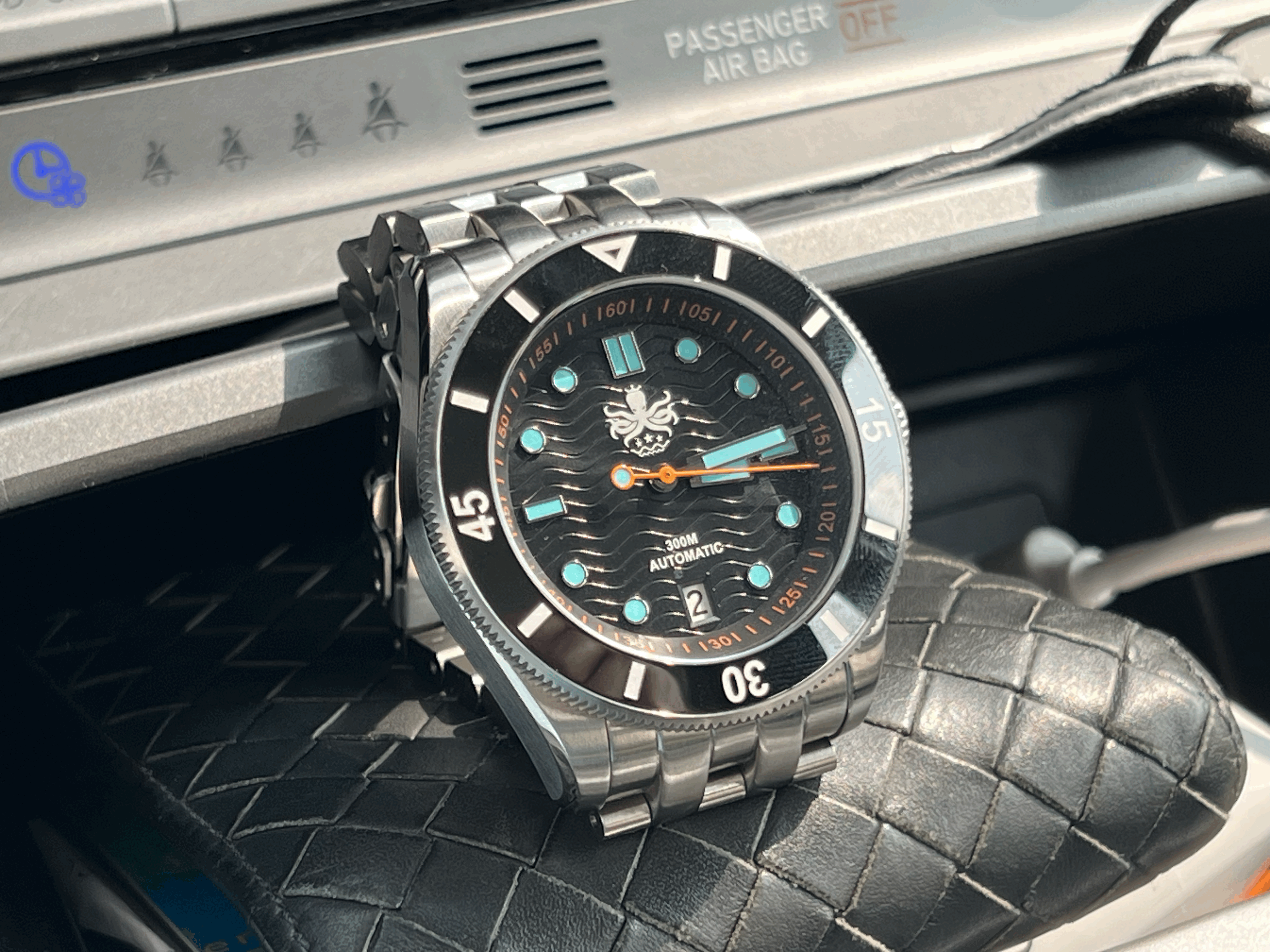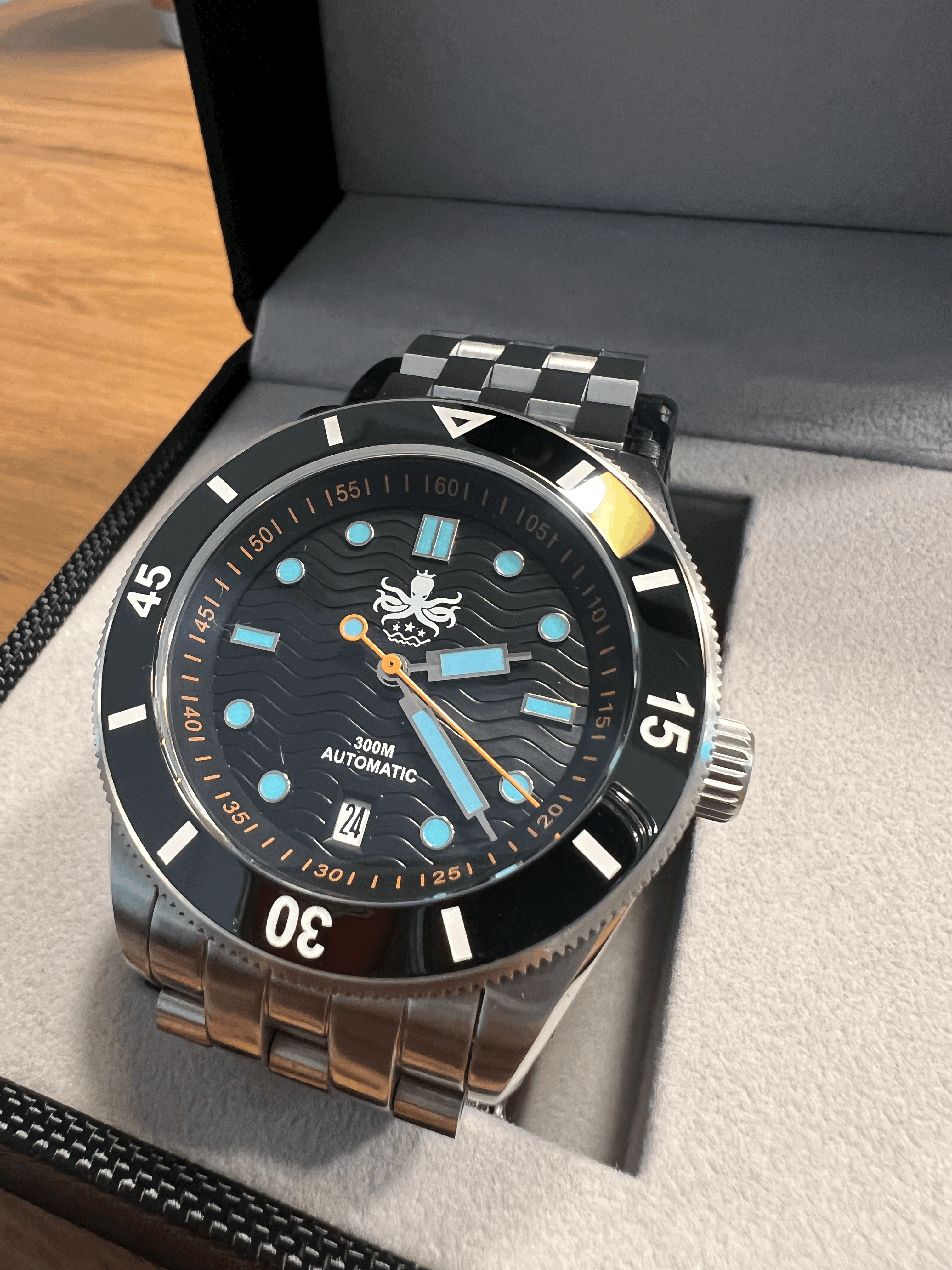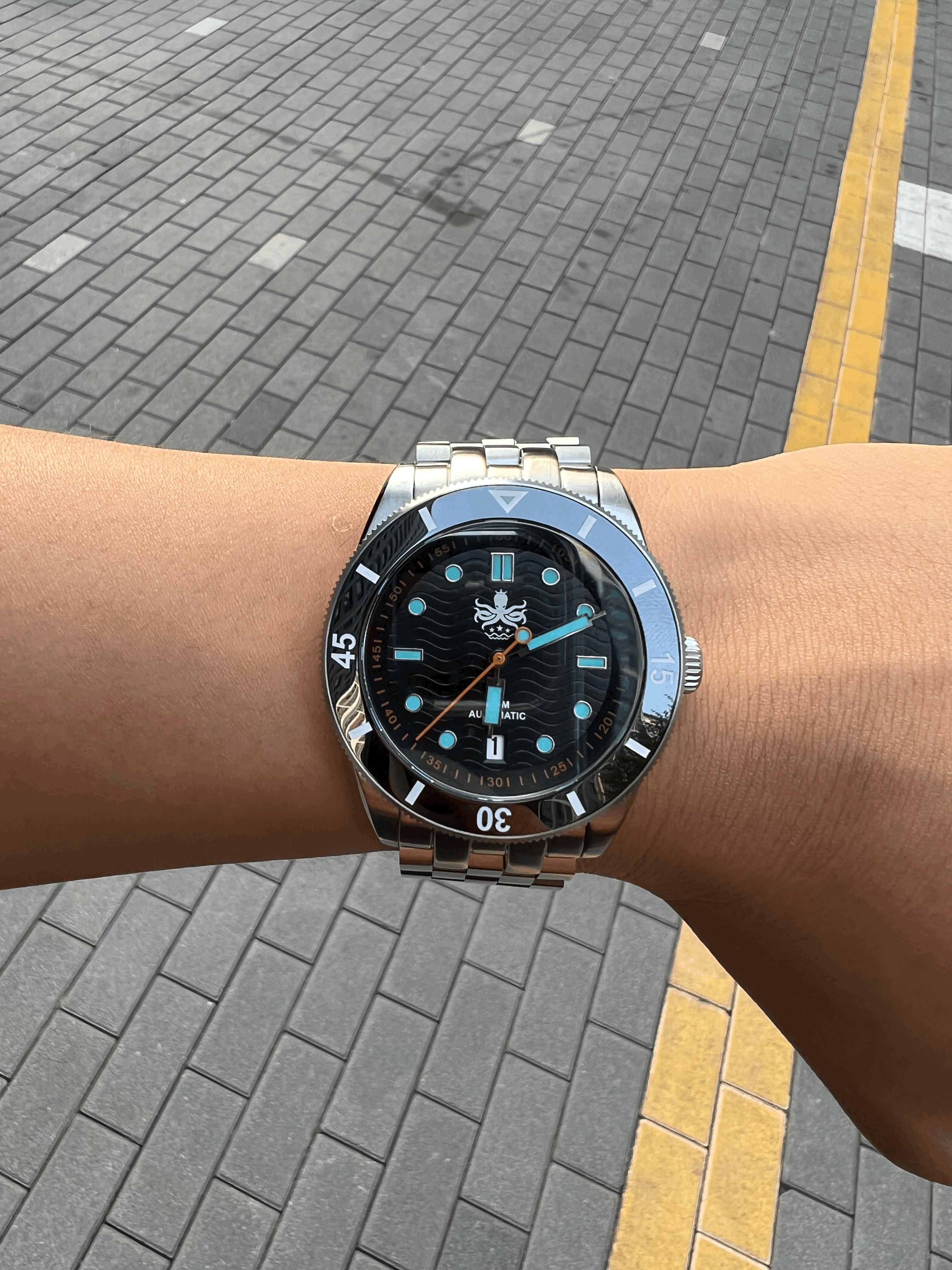 웨이브마스터는 튼튼한 스테인레스 스틸 케이스와 120 클릭의 회전 가능한 세라믹 베젤을 특징으로 하고 있으며, 다이얼부는 사파이어 크리스털 유리로 보호되어 내구성을 높였습니다. 베젤까지 세라믹으로 되어있는 것은 오버스펙이 아닐까 싶을 정도네요. 쿼츠가 아닌 오토매틱 시계로 초침의 흐름을 보는 것 또한 재미요소입니다. 무브먼트는 NH35를 사용하여 가격과 실용성을 둘 다 잡았습니다. 다이버 시계에 어울리는 밝게 발광하는 시간 표시 인덱스와 시분초침을 포함하여 어둠 속에서도 가시성을 높였습니다. 다이얼은 웨이브 마스터라는 이름에 걸맞게 파도치는 형상을 음각하여 심심하지 않게 표현하였고, 6시 방향의 데이트는 전체적인 밸런스를 맞추는 것에 일조합니다. 저는 평소 문서작업이 많아 데이트가 있는 시계를 선호합니다. 그중에서도 3시 방향보다는 6시 방향의 데이트가 개인적으로 더 마음에 듭니다.
