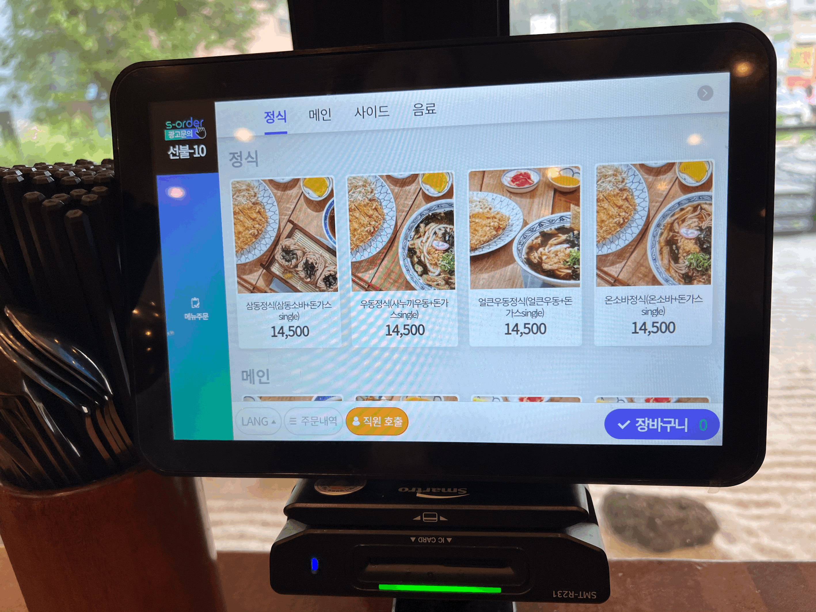 용인 소바 맛집 삼동소바의 매장 주문 키오스크 화면입니다. 모든 메뉴가 확실한 음식사진과 함께 표현되어 있어 직원의 도움이 없이도 편하게 주문할 수 있습니다. 다만 문제는 가짓수가 많아서 선택장애가 생길 수 있다는 점인데요. 저희는 유아를 포함하여 3명이 방문하였는데 3개 메뉴 +@를 주문하였습니다. 총금액은 4만 원대로 최근의 물가를 생각하면 그렇게 비싸다는 생각이 들지는 않더군요.