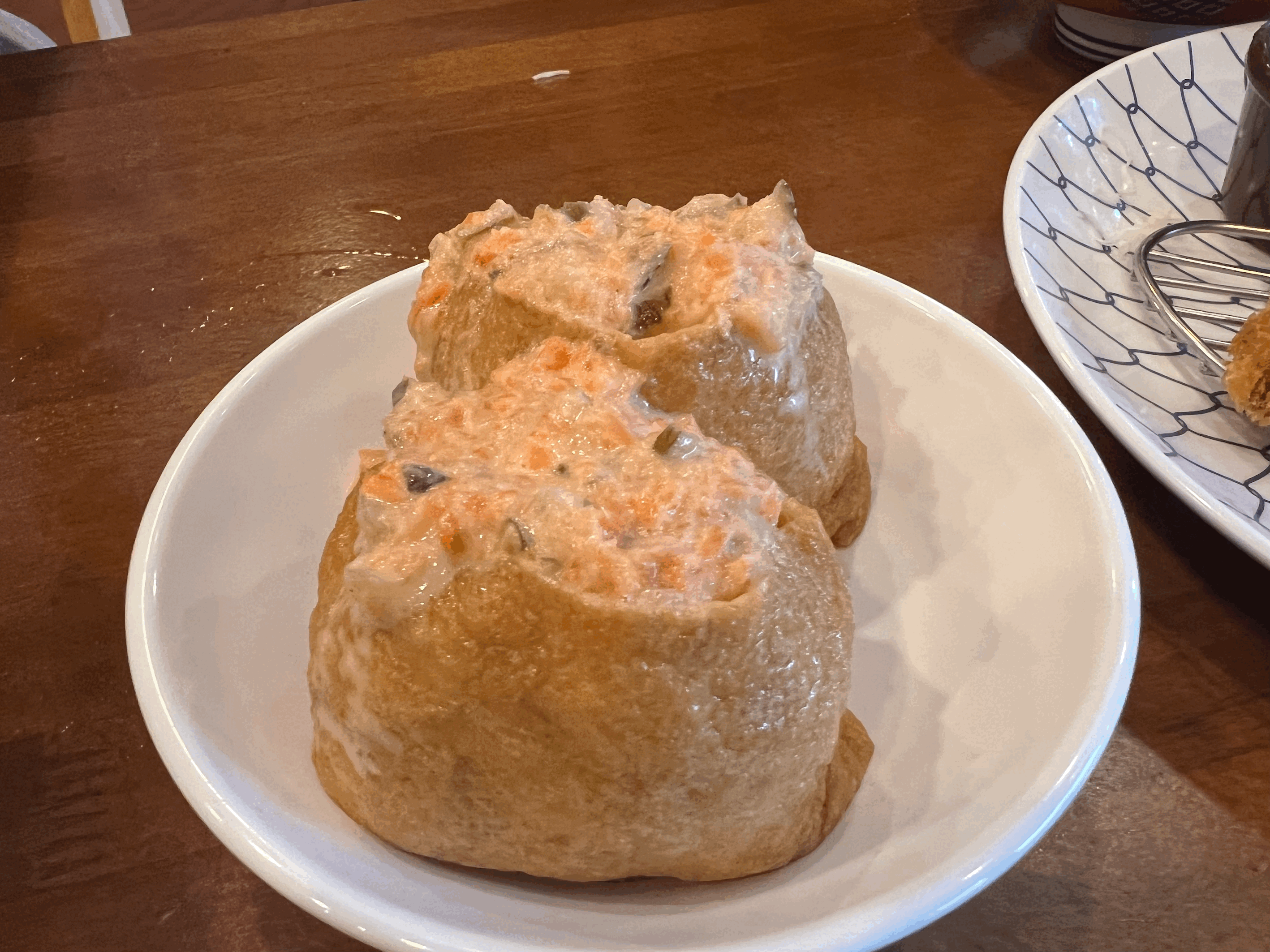 사이드 메뉴로 나온 유부초밥과 대게튀김입니다. 유부초밥은 4,500원이나 하는 단품가격에 비하여 조금 장난스러운 맛이 났습니다. 참치마요의 맛이 너무 강해 이게 유부초밥인지 참치마요 초밥인지 헷갈릴 정도였으니까요.